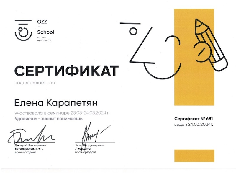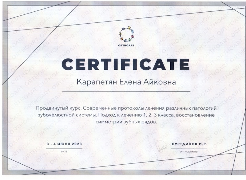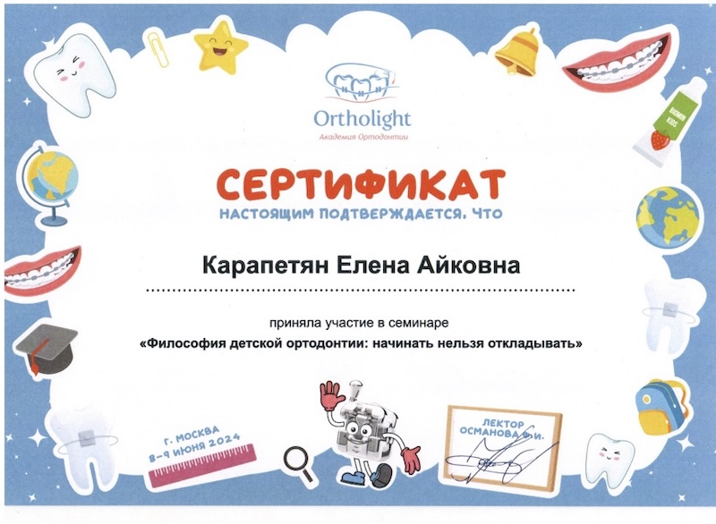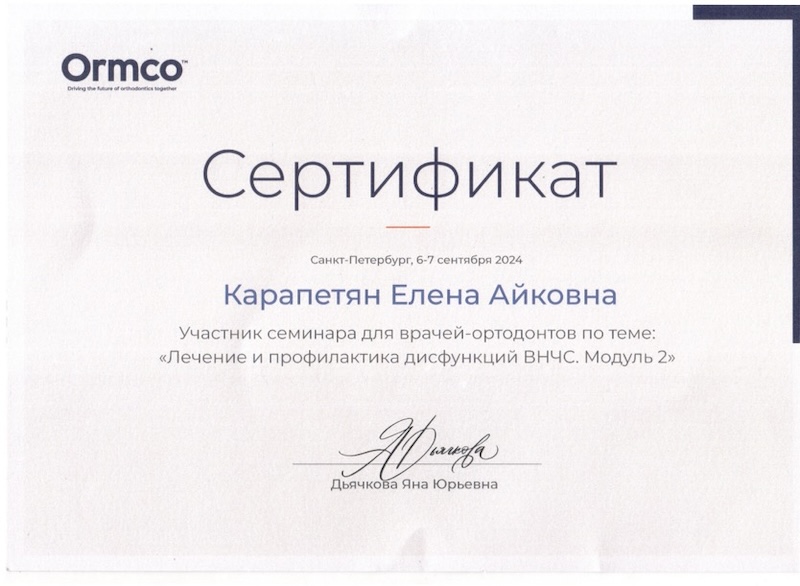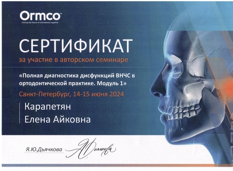 - Ординатура — ПСПбГМУ им. ак. И.П. Павлова, врач-ортодонт