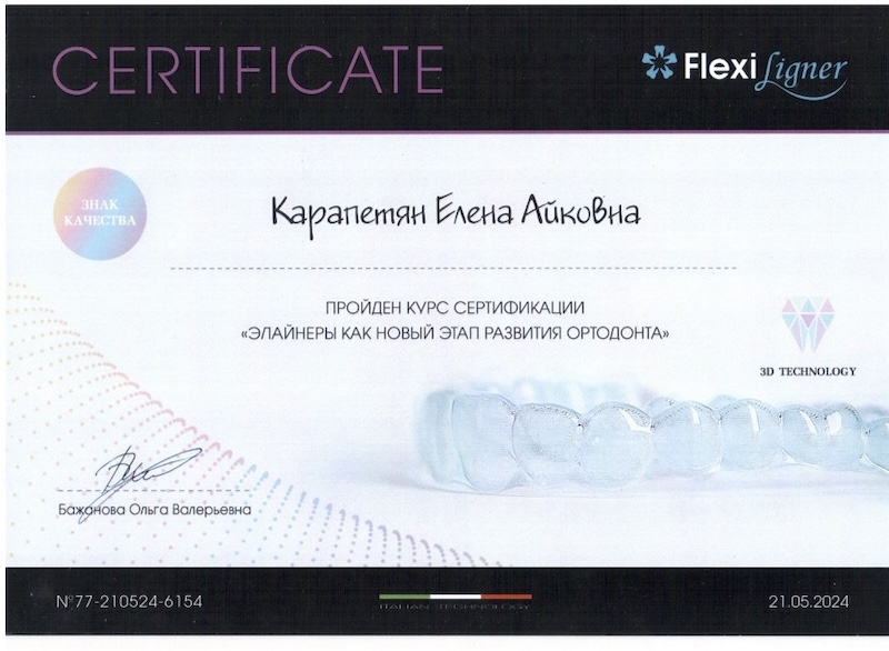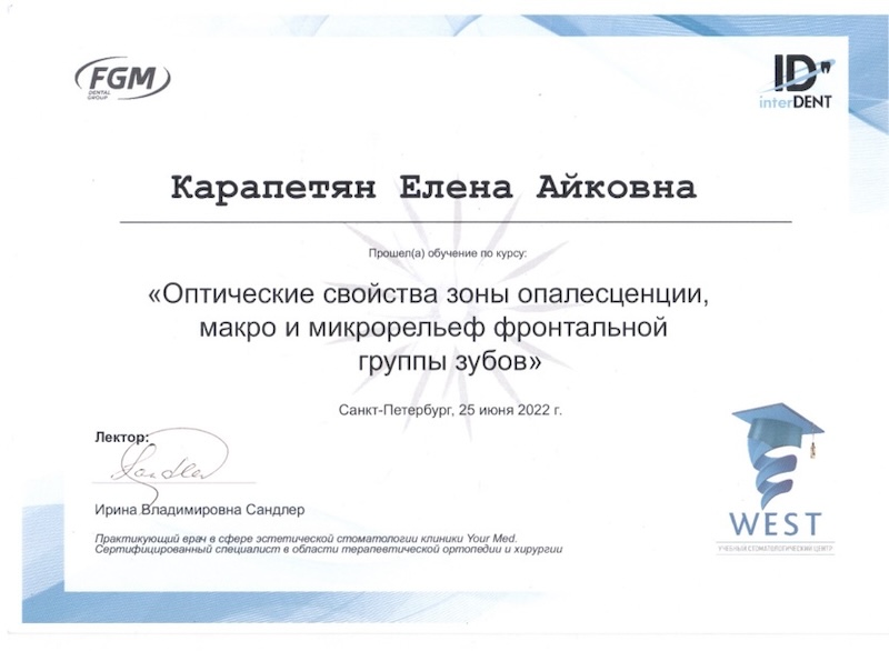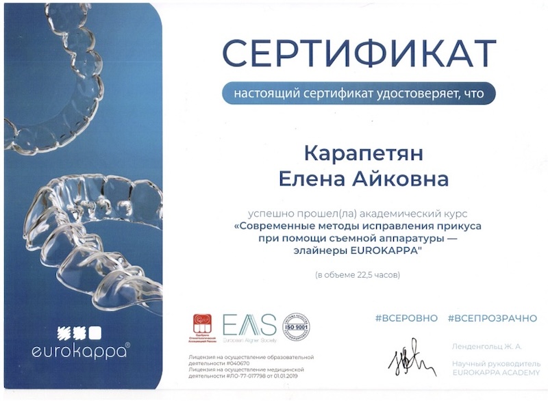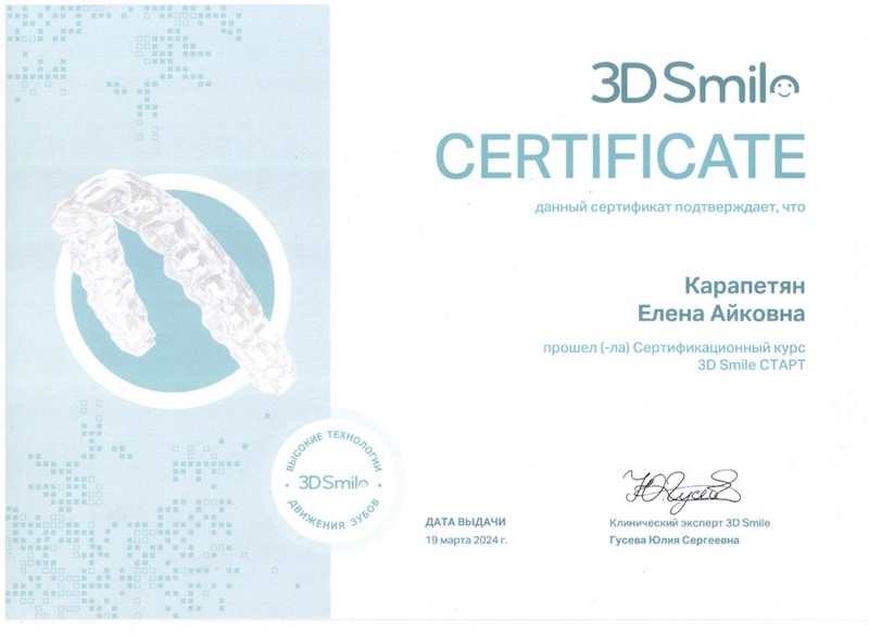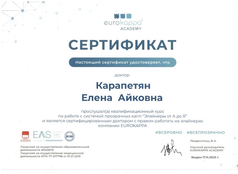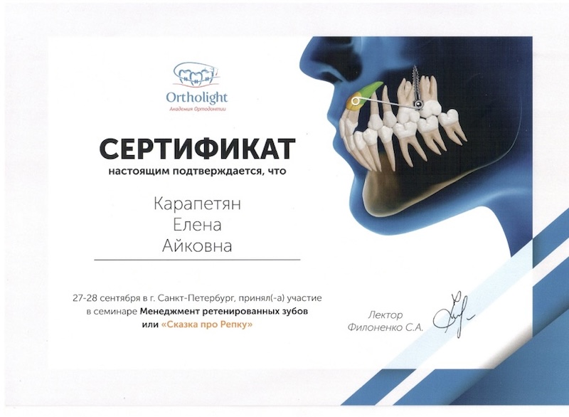 - Диплом специалиста — ПСПбГМУ им. ак. И.П. Павлова, врач-стоматолог