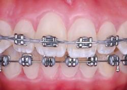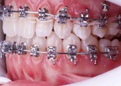 Установка брекет-системы. На зубы фиксируются специальные замочки (брекеты), которые соединяются дугой. Именно дуга создает мягкое, постоянное давление, перемещает зубы в нормальное положение.
